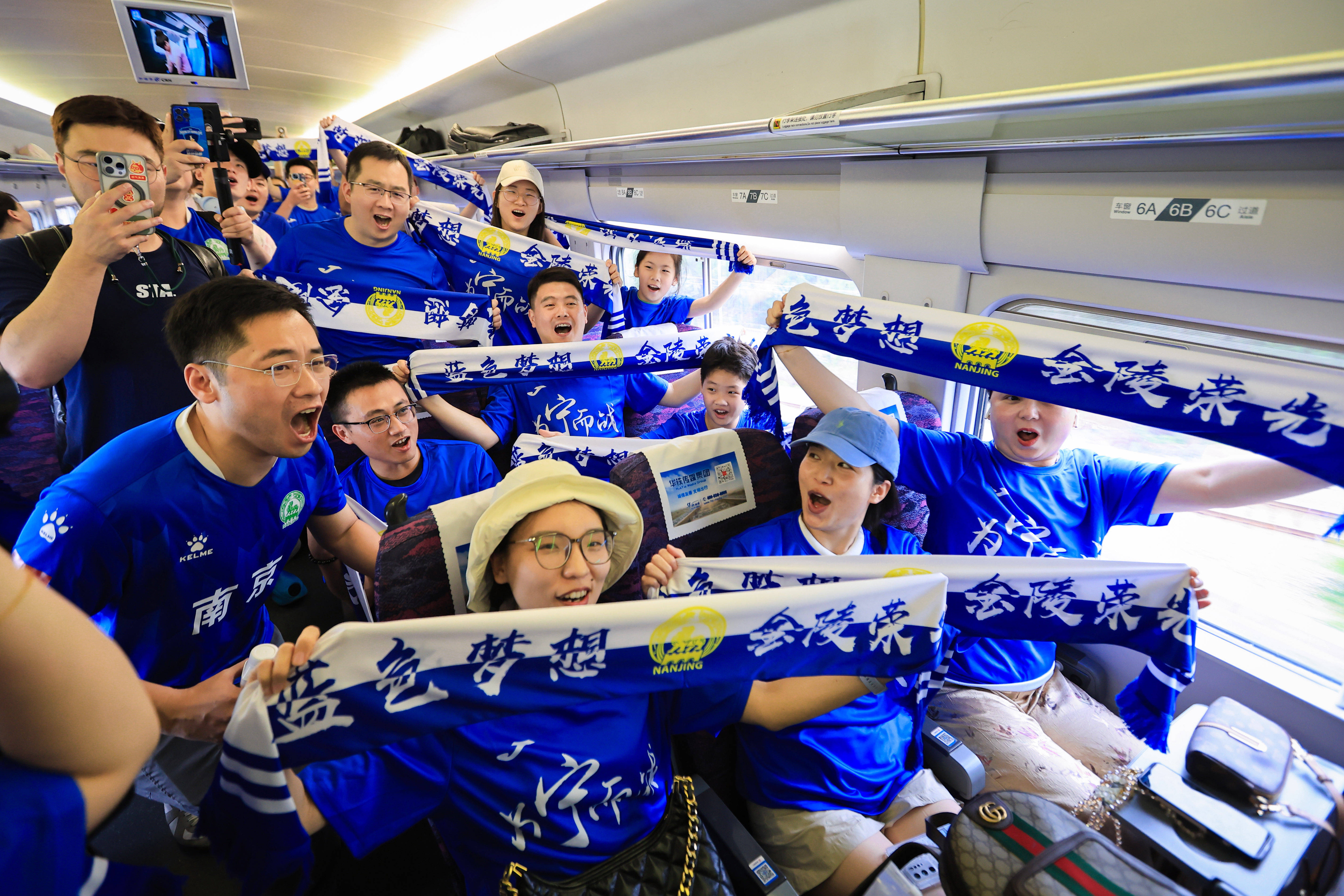 6月14日,球迷们在G9253次列车上合影眷恋。当日,2025年江苏省城市足球联赛第四轮淮安队对阵南京队的比赛在江苏省淮安市举行,铁路部门开行南京站往来淮安东站的长三角首趟“苏超”球迷高铁专列,便捷南京球迷赶赴不雅赛。新华社发(苏阳 摄)官方越是“放得开”,就越有妙手在民间。