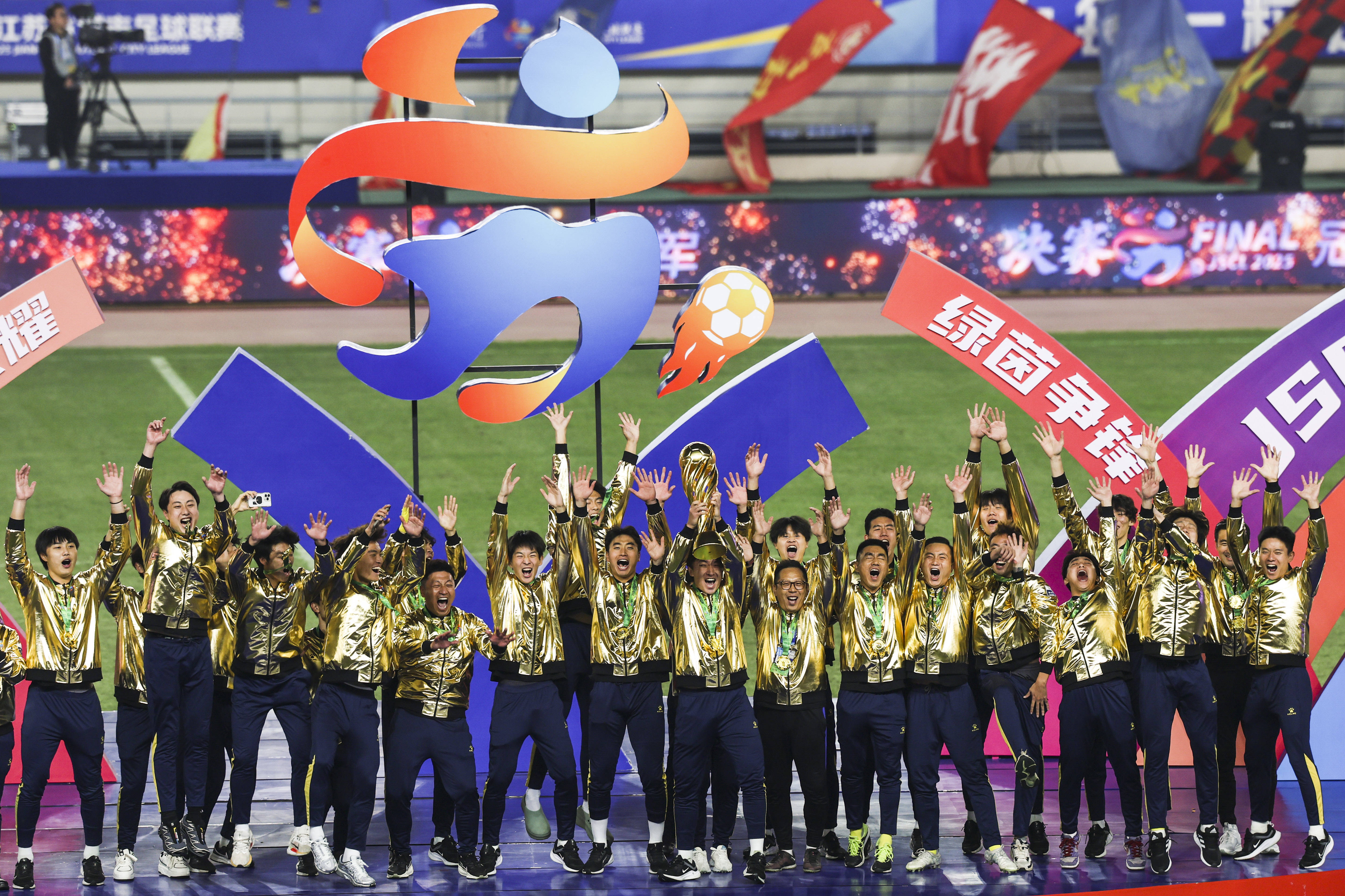 新华社南京11月2日电(记者余孝忠 李丽 王恒志)战旗摆动,万东谈主空巷。1日晚的南京奥体中心,在创记录的全场62329名不雅众的大叫声中,在《颂赞故国》的大齐唱里,江苏省城市足球联赛在历时半年后迎来终章,泰州队最终捧杯。