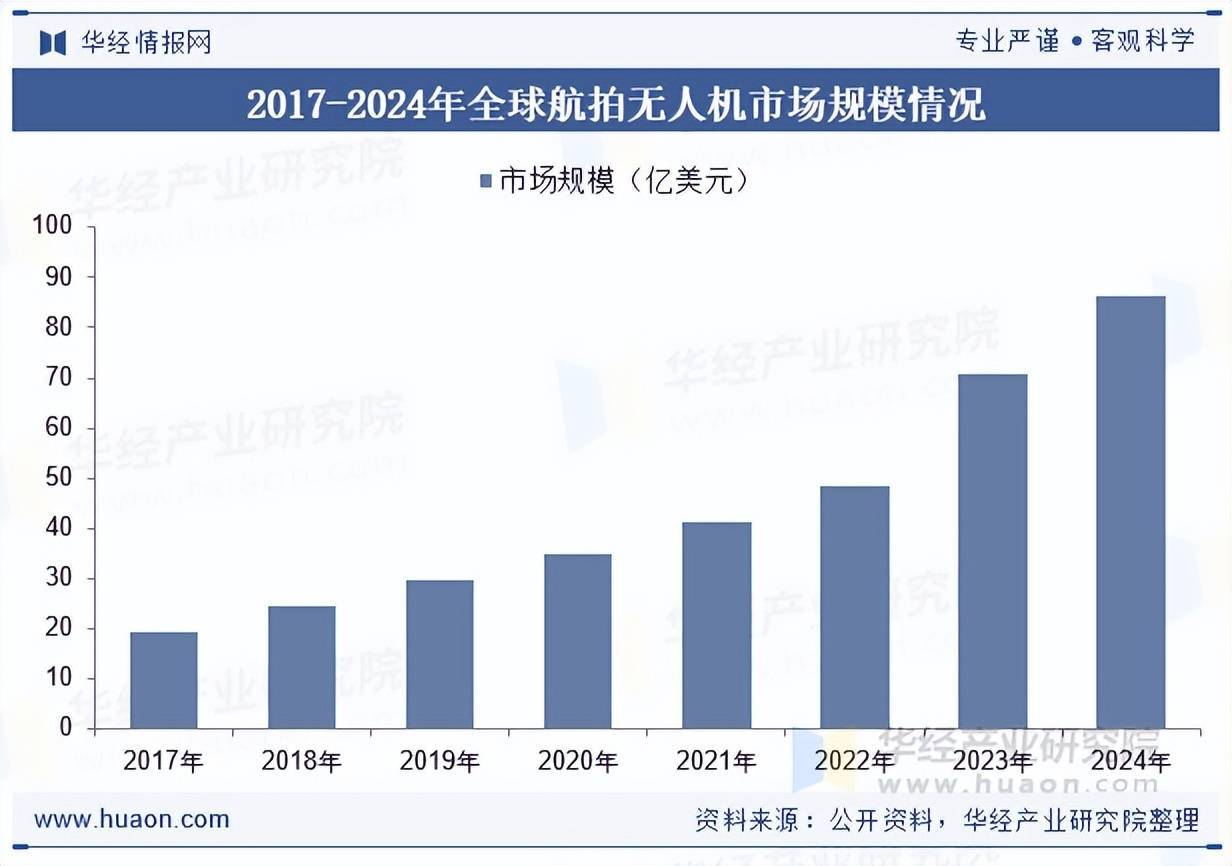 2014年大疆发布产物Phantom2Vision交融了智能影像树立与飞控时间,开发了智能影像树立新的细分领域航拍无东说念主机的市集。通过在无东说念主机上搭配全景相机、畅通相机组件可丰富航拍无东说念主机的拍摄功能,普及拍摄质料。据统计大众航拍无东说念主机的市集界限从2017年的19.2亿好意思元增长至2024年的86.2亿好意思元,年复合增长率约为23.92%。