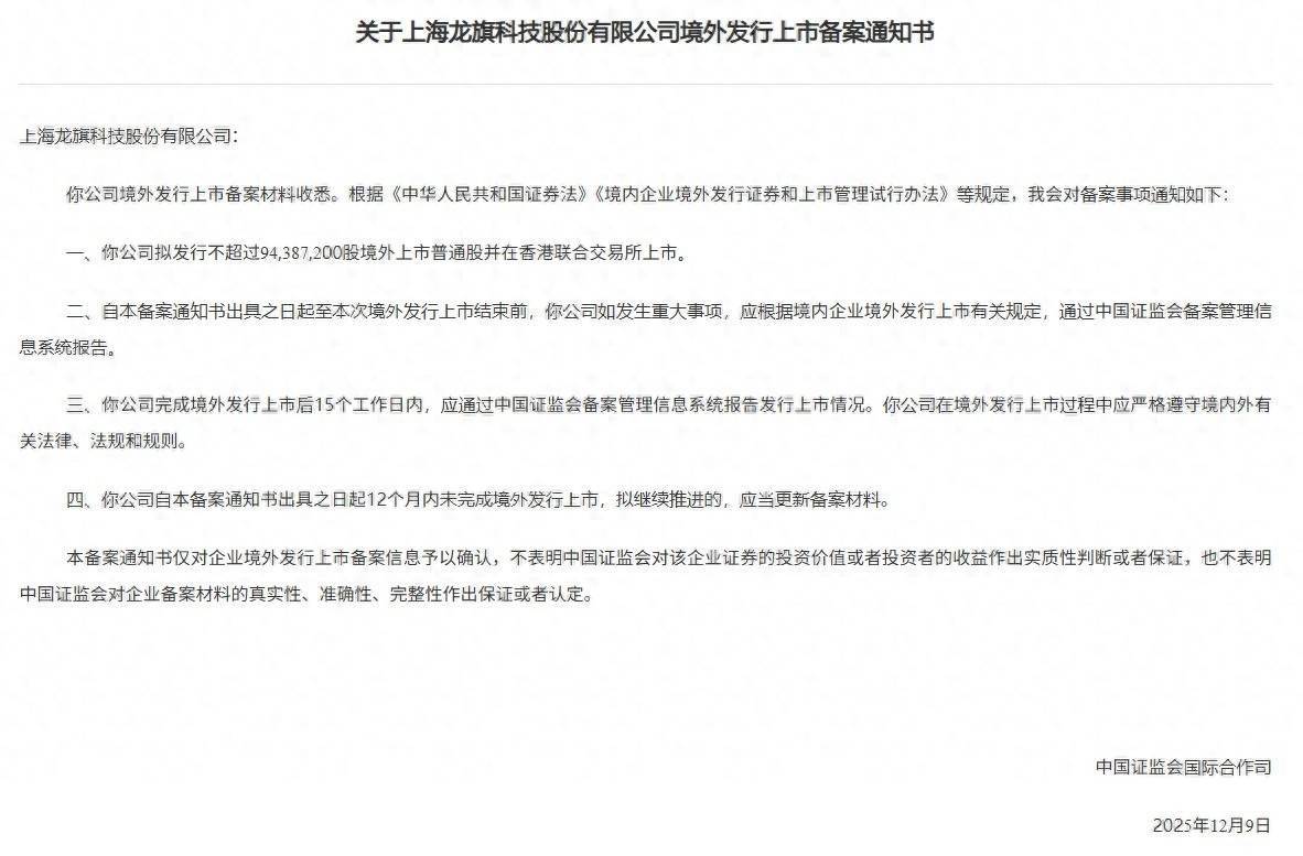 智通财经APP获悉体育游戏app平台,12月10日,中国证监会海外协作司发布《对于上海龙旗科技股份有限公司境外刊行上市备案见告书》。龙旗科技(603341.SH)拟刊行不逾越94,387,200股境外上市豪爽股并在香港持续交游所上市。
