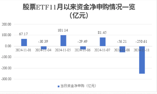 双十一当日,股票ETF资金净流出超250亿元,创出2005年2月22日以来单日资金净流出的历史新高。