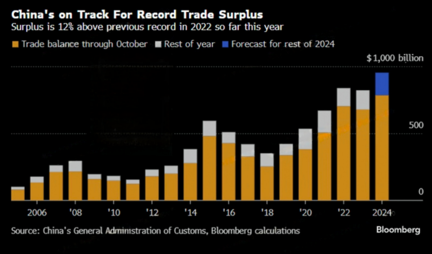 11月11日,BP社报谈,2024年中国贸易顺差可能创历史新高。