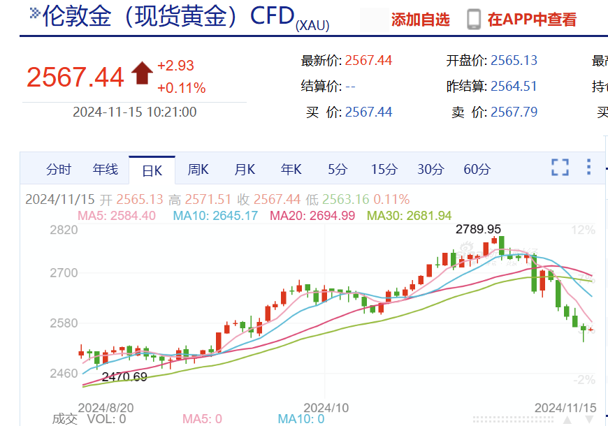 黄金从10月30日见顶,随后步入下落通谈,司法11月15日,还是跌破2600.
