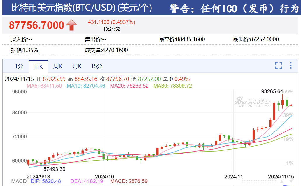 截止11月12日,比特币初次冲破88000点,11月13日更是若90000好意思元,最高摸到93265,不外随后比特币也驱动诊疗,11月15日价钱为87756。