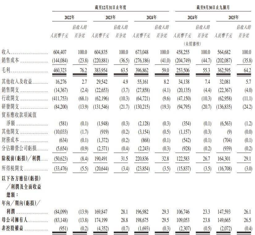 于2022年度、2023年度、2024年度、2025年升天9月30日止九个月,公司分别录得毛利4.60亿元、3.84亿元、3.97亿元、3.63亿元,对应毛利率为76.2%、63.5%、59.0%、64.2%。