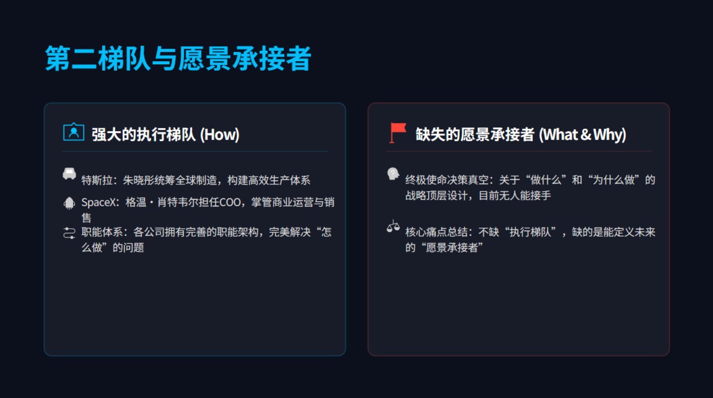 准确的刻画是:马斯克帝国不缺“奉行梯队”,缺的是“愿景邻接者”。