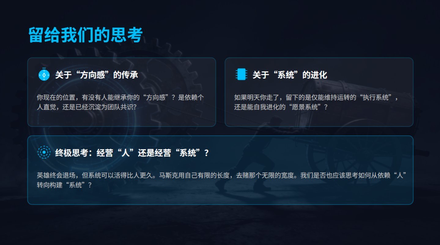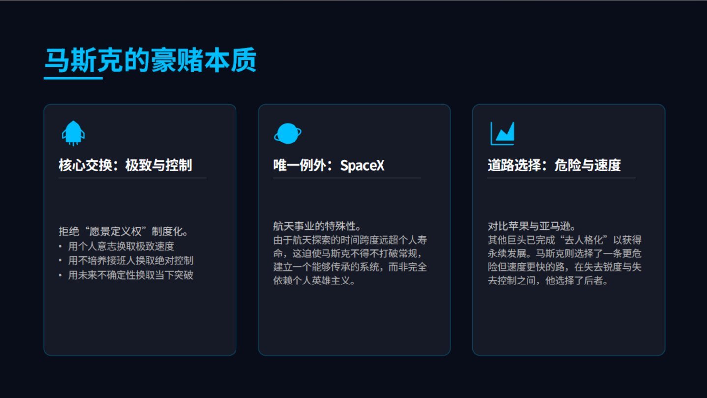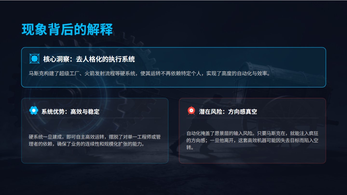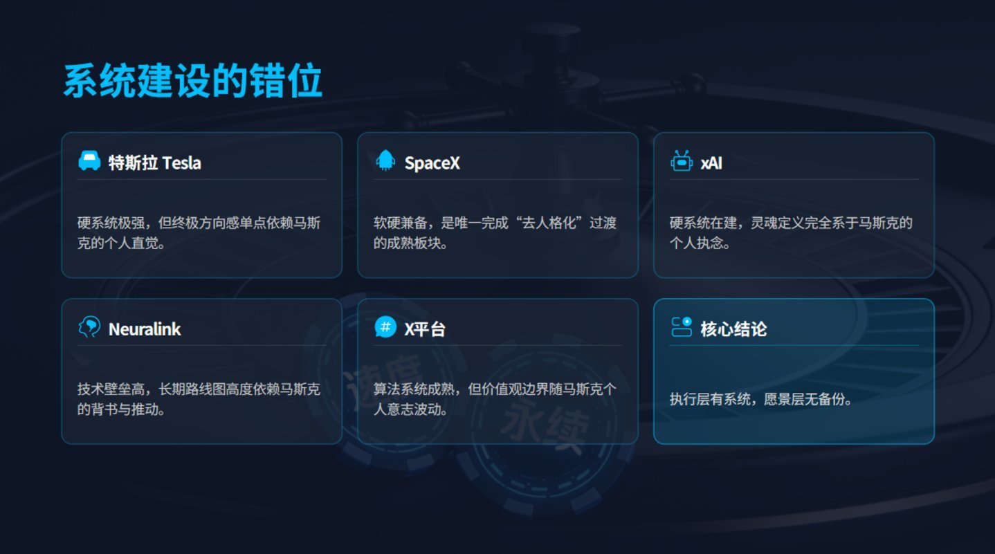 要是来日马斯克不在了,这套“硬系统完备、愿景层真空”的羼杂方式,还能撑多久?