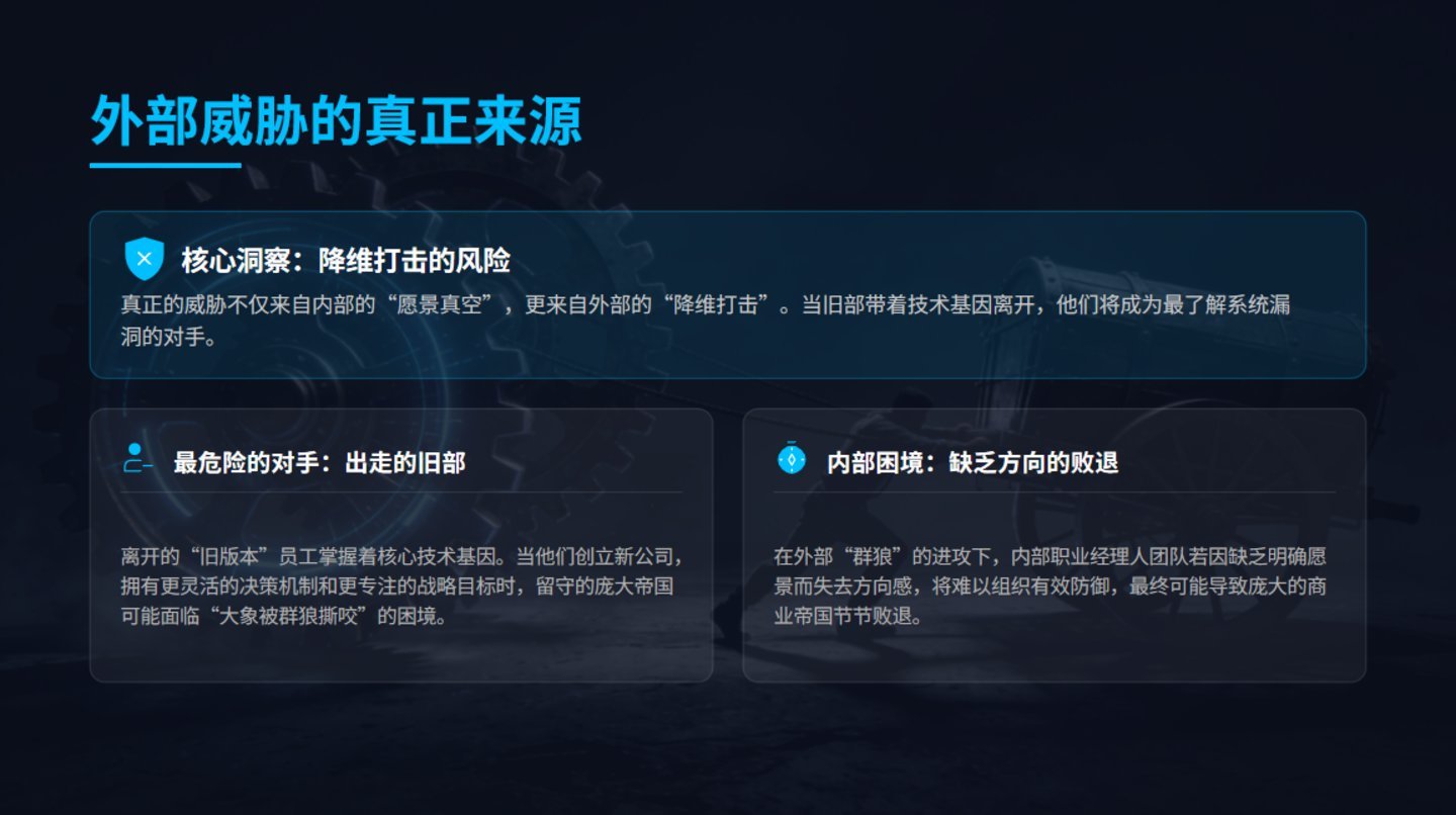 当昔日辖下带着雷同的期间基因,却领有更活泼的方案机制和更专注的计谋野心时,留守的广阔帝国可能靠近“大象被群狼撕咬”的逆境。